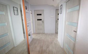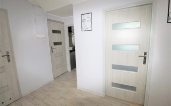 korytarz powierzchnia około 8m2, przestronny, w korytarzu znajduje się duża szafa typu Komandor, sufit podwieszany, na ścianach tynk strukturalny, na podłodze terakota w jasnym kolorze, taka sama terakota znajduje się również w kuchni oraz w łazience i wc